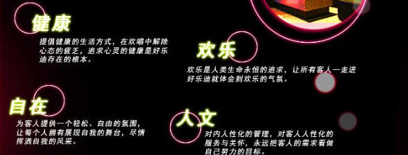 作为一家成立于1998年的公司,自成立以来,始终秉承“健康、欢乐、自在、人文”的经营理念,这种经营理念能够舒解都市人快节奏的生活方式,进而打造成极具特色的时尚场所。经营原则上,公司志在打造价格低、音响好、歌曲全、服务到位的公司形象。对外拓展中,始终紧跟国际步伐,为致力于成为全国皆知的KTV品牌而不断奋斗。