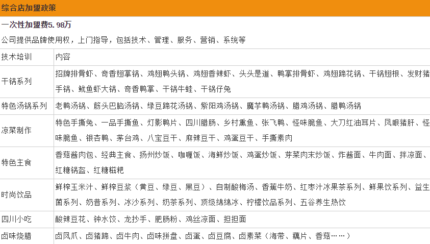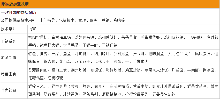 通过以上表格可以看出,一品香锅加盟费分别是:标准店一次性加盟费为3.98万元,综合店加盟费为5.98万元,大家可以根据自身经济实力看一下,是否适合加盟。