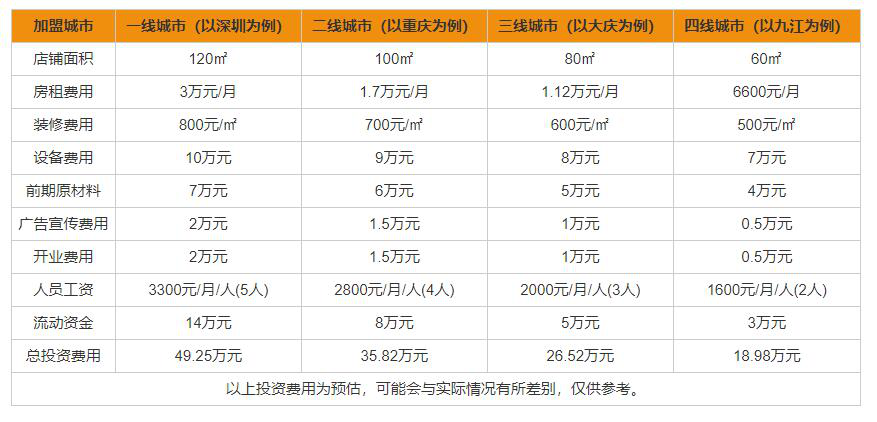 幸福西饼加盟费多少?通过上表,我们可以了解到,幸福西饼加盟费分别是一线城市(以深圳为例)需要49.25万元、二线城市(以重庆为例)需要35.82万元、三线城市(以大庆为例)需要26.52万元、四线城市(以九江为例)需要18.98万元。这么详细的幸福西饼加盟费用分析,对您是不是有很大的帮助呢?如果您也对加盟我们的幸福西饼感兴趣的话,可以直接输入您的号码与我们取得联系哦!