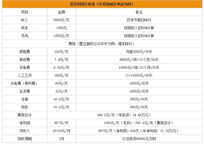 从表格中可以看出,单店模式下在县级城市开一家面积为20㎡的卤三国卤味熟食店,一填的净利润在857元,一年的净利润为31.28万元,回收周期在3个月!