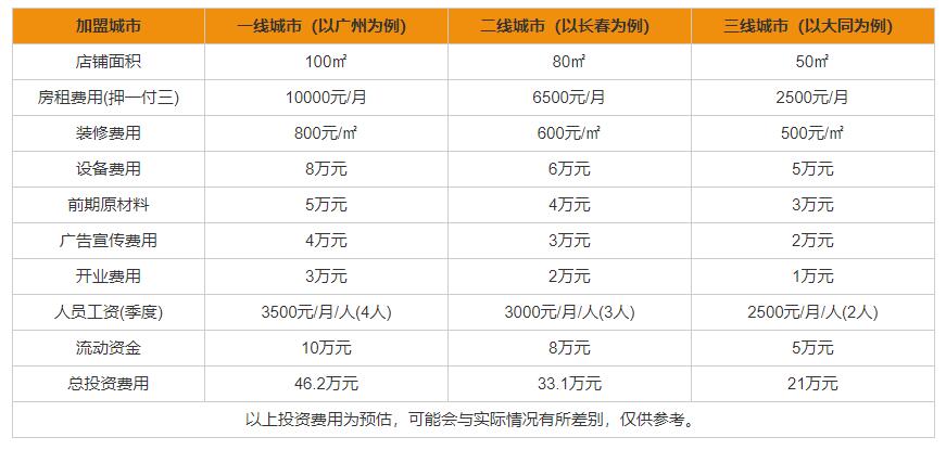 从上图可以看出,乐堡士加盟费是依据地区来决定的,一线城市100㎡大概需要46.2万元,二线城市需要80㎡33.1万元,三线城市50㎡21万元。这个投资费用的预估是考虑多种因素结合得出的,大概费用还是要根据投资者自身情况。乐堡士县级加盟多少钱?当然也需要根据具体情况而定!