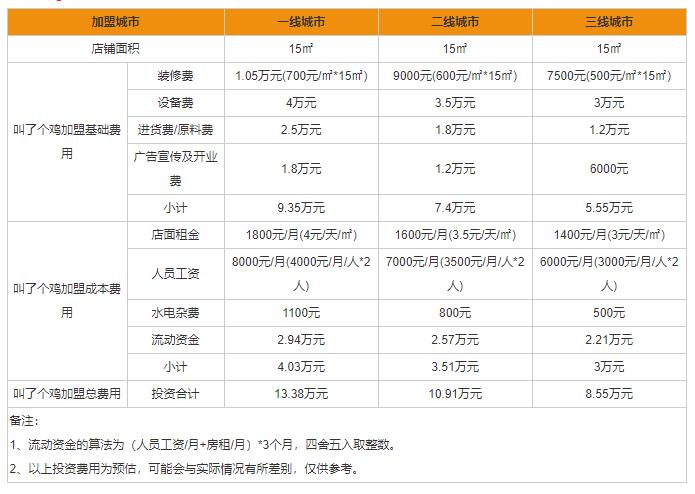 叫了个鸡加盟费多少钱?看过了上表大家知道了,叫了个鸡加盟费分别是一线城市需要投资13.38万元、二线城市需要投资10.91万元、三线城市需要投资8.55万元。如果您看好这个品牌并且已经准备好了那么多费用,就不要犹豫啦,赶紧行动起来吧!