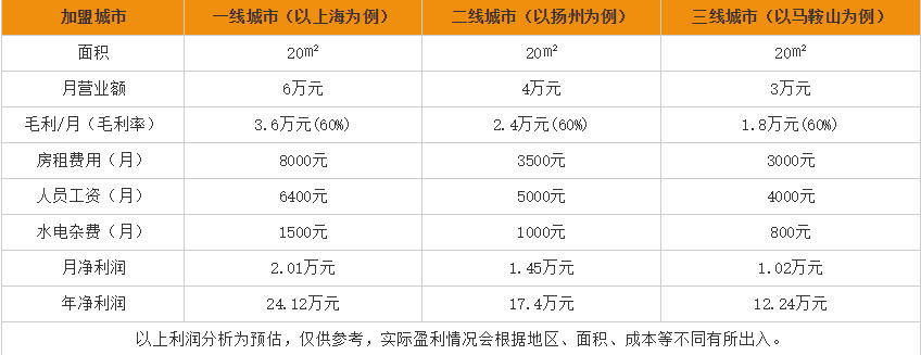 通过上图分析得出:巴比馒头在一线城市上海的20平米的门店,每个月的营业额在6万元,在扣除房租、原材料费、水电杂费、员工工资后,每个月的净利润在2.01万元,每年的净利润在24.12万元;巴比馒头在二线城市扬州的20平米的门店,每个月的营业额在4万元,在扣除房租、原材料费、水电杂费、员工工资后,每个月的净利润在1.45万元,每年的净利润在17.4万元;巴比馒头在三线城市马鞍山的20平米的门店,每个月的营业额在3万元,在扣除房租、原材料费、水电杂费、员工工资后,每个月的净利润在1.02万元,每年的净利润在12.24万元。