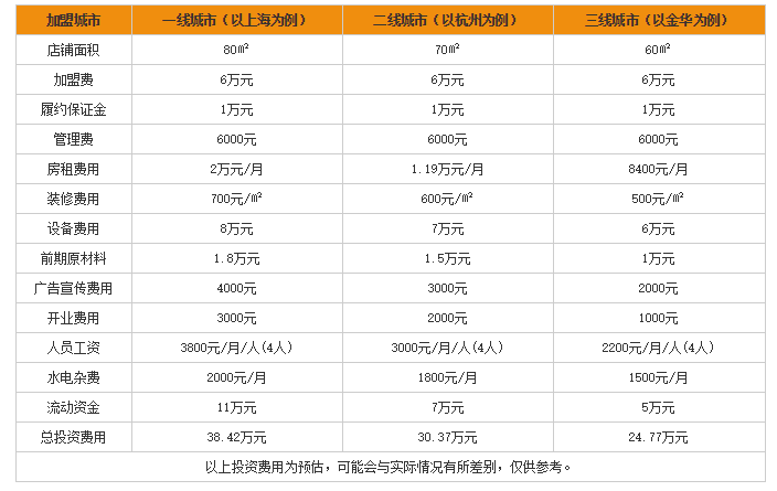 池上便当加盟费多少?看完了上表,我们也知道了,不同城市所需的费用也是不同的,池上便当加盟店的投资费用在7万元。整店投资根据一级、二级、三级城市的划分分为38.42万元、30.37万元、24.77万元,也就是说最低只需要投资24.77万元就可以拿下池上便当的代理销售权。各位想要加盟创业的朋友们,可以根据自身的实际需求和经济情况来选择最适合自己的加盟方式。