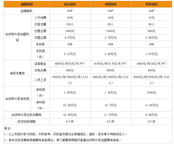 台资味月利润如何?从上图可以看出,开一家台资味外卖便当加盟店,省会城市一年的净利润为22.68万元,地级城市一年的净利润为16.7万元,县级城市一年的净利润为11.66万元,也就是说,最低每年的净利润都有11.66万元,当然这只是初期,后期随着市场的扩大以及客流量增加,净利润当然是节节高升!