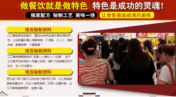 先来简单了解一下口口香烤猪蹄的项目情况。 口口香烤猪蹄的成功源于一次腌制秘方的失误和一次破罐破摔的烤制,让本来酱吃的猪蹄成了烧烤猪蹄,腌料秘方,中草药香粉,烤出来的猪蹄色香味美,因调料、火候不同而产生数十种不同变化,满足不同消费需求。