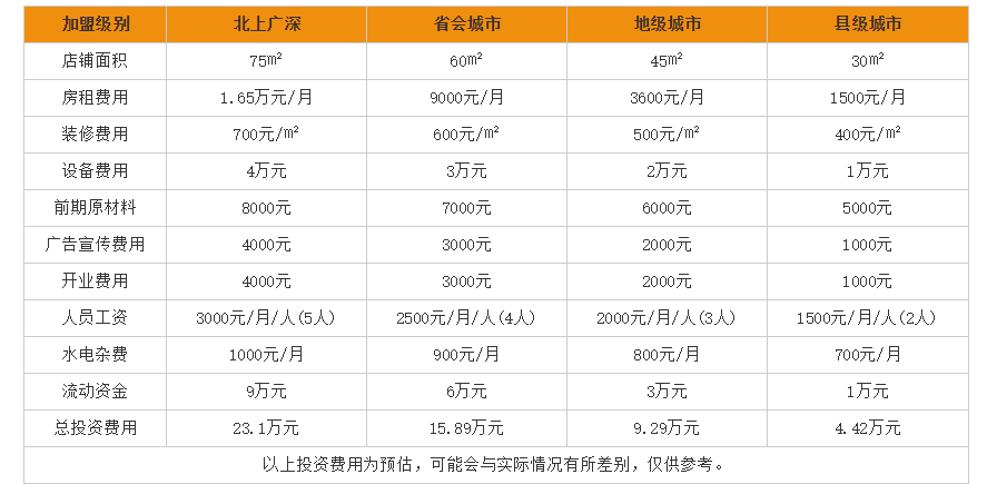 口口香烤猪蹄加盟费多少?开一家口口香烤猪蹄,因为加盟商的实际情况不同,所以我们以不同城市区域进行划分,总结出如上数据:北上广深城市开一家口口香烤猪蹄需要总投资加盟费用为23.1万元;省会城市开一家口口香烤猪蹄需要总投资加盟费用为15.89万元;地级城市开一家需要总的投资费用为9.29万元;县级城市同样开一家口口香猪蹄需要4.42万元。也就是说,最低投入4.42万元就可以开一家口口香猪蹄加盟店!