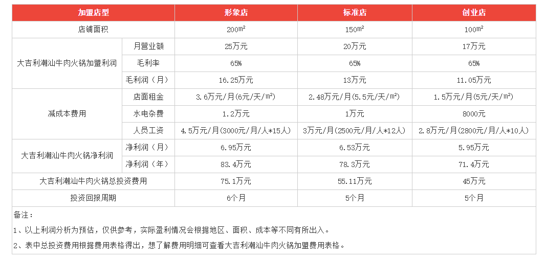 大吉利火锅利润多少?一张表格足以分析出问题。可以看出,开一家面积最大的形象店所能取得利润当最高,年净利润在83.4万元,此时的投资总费用在75.1万元,投资回报周期为6个月;同理次之,标准店一年的净利润在78.3万元,此时的总投资费用在55.11万元,投资回报周期在5个月;最后,开一家创业店,面积最小,但也有100㎡,此时的投入在45万,但是收益却在71.4万元!建议如果初期创业的话,可以选择开一家创业店,等到后期资金积累,在考虑扩大店面与经营范围!