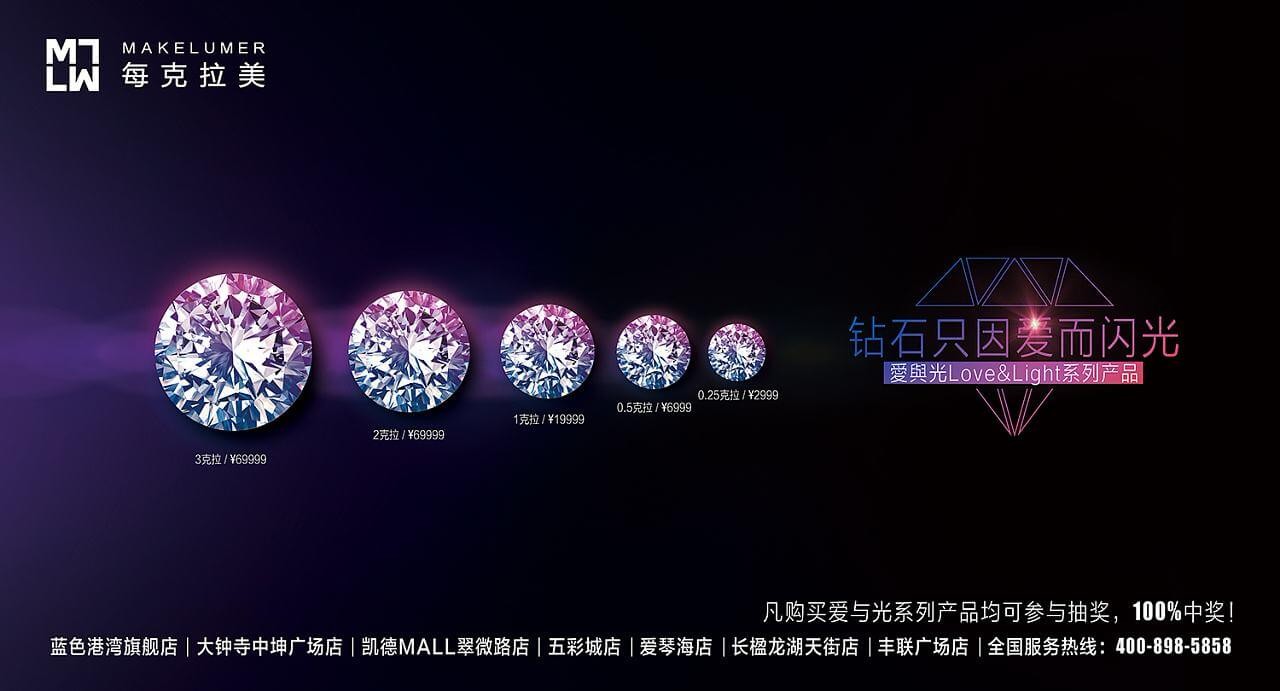 每克拉美成立于2010年1月,是国内首家专业的全渠道钻石零售品牌,通过"网络+实体"的运营模式,为广大消费者提供钻石镶嵌首饰、钻石裸石、钻石定制、钻石投资等产品及服务。