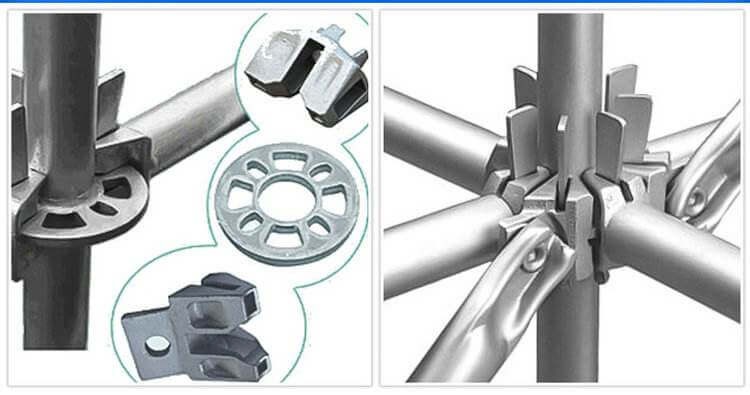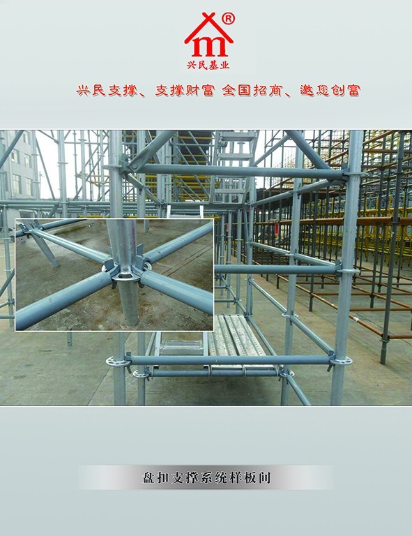 根据具体施工要求,能组成立杆模数为500mm与横杆(水平杆)300mm的多种组架尺寸和荷载的单排、双排脚手架、支撑架、支撑柱、物料提升架等多种功能的施工装备,并能做曲线布置。脚手架能与可调下底托、可调上托、双可调早拆、挑梁、挑架等配件配合使用,可与各类钢管脚手架相互配合使用,实现各种多功能性。一是可在任何不平整斜坡及阶梯型地基上搭设;二是可支撑阶梯形模版,可实现模版早拆;三是可实现部分支撑架早期拆除,可搭设通行道,挑檐飞翼;四是可配合搭设爬架、活动工作台、外排架等,实现各种功能支护作用;五是可作为仓储货架,可用于搭设各种舞台,广告工程支架等。其立杆具有套筒按500mm模数任意接长的功能,还具有倒头对接使用功能,为特别高度尺寸的使用提供了便利条件。