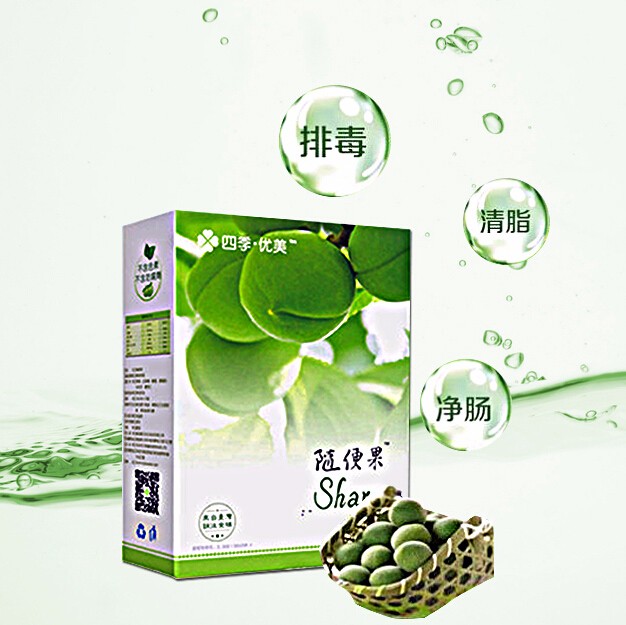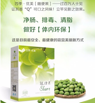 四季优美随便果它是由鲜果(青梅)经过草本植物(蜂蜜、桑叶粉、决明子、郁李仁)特别泡制而成,因此含有丰富的酵素和乳酸菌!百分百纯天然,无添加剂,无毒无副作用,集缓解便秘、排除宿便、清洁血液、消痘祛斑,醒酒解毒、减脂控重、纤体收腹、调内分泌为一身,男女老少皆宜的快消、排毒产品。可以出口海外,有发明专利、质检报告、认证证书及52国销售证!只要你吃过,我相信你一定会爱上这颗小果子的!