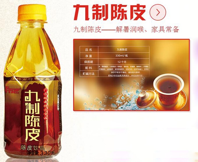 九制陈皮为原料、纯净水熬制、UHT瞬时灭菌工艺,是东鹏九制陈皮饮品的三大特点。九制陈皮饮料对解暑润喉、解腻开胃有特殊功效。陈皮性味辛、苦、温,入脾、肺经,有行气健脾,燥湿化痰,降逆止呕之功,是治疗睥胃气滞,脘腹帐满,不思饮食,嗳气呕吐,消化不良的常用。九制陈皮采用优质的柑橘皮为原料,经过拣皮、浸漂、保鲜、切皮、腌制、沥干、调料、反复晒制、贮存、包装等九个工序,始成正式产品。因工艺繁杂严谨,故称之“ 九制 ”。东鹏九制陈皮在华南市场多年的深耕中,深得广大消费者喜爱。