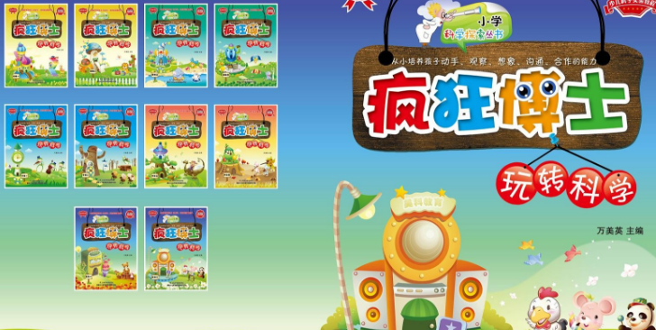 课程简介:《疯狂博士玩转科学》系列科学探索课程突出了科学性、思想性、实用性和趣味性,丰富了少儿对自然科学的认识和体验,是现代少儿不可或缺的素质教育教材之一!本课程的教学对象为3-12岁的孩子,每年分上、下学期共10册。每个阶段有15个探索主题。其中涉及力学、光学、电学、化学、自然科学等知识,共130个探索主题。本套课程配套书籍和实验器材,让学生能够通过“自己动手做实验、亲身感受科学奥妙”,激发学生学习科学的兴趣,让他们在探索中轻松掌握科学知识。请点击博客:响应国家提倡的科技进校园,经过多年的研究和实践,2006年8月正式推出《疯狂博士玩转科学》之少儿科学探究实验、小学科学探索实验和中学科技体验系列,涉及声、光、电、磁、力、天文、地理、生物、医学、机械、能源、色彩、化学、数学、热学等18个门类,近400种产品,1000余个小实验。