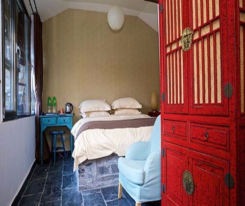 内部则是传统古朴的装修风格,五星级的装修标准。木门木窗加衬双层钢化玻璃,青石铺地,安装地采暖设施以及采用麦秸秆取暖炉等。家具摆设中很多衣柜、备案桌子都是从村民手里淘来的老物件。精品厨卫配备,满足现代品质生活。