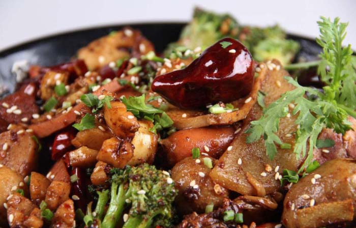 麻辣香锅,具有辣而不燥、鲜而不腥、入口窜香、回悠长的独特口味。香锅制作中对辣椒的选用有着特别的要求,尤以川西的“二荆条”为优佳,因为这种辣椒颜色鲜艳、香浓郁、辣感柔和。而香锅的香料采用四川专属的几十味特殊原料,经现代工艺精制而成,不伤胃、不上火、色泽艳,故有“一锅红艳”之称。该香锅香气扑鼻、滋味柔和纯正,在制作上采用单锅单炒,一次使用,迎合现代人对健康的求!