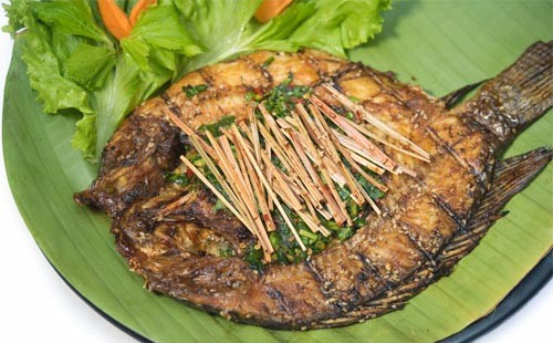 由于香茅草烤鱼做法独到、香料独特、鲜香可口,在傣味菜肴中知名度非常高,是傣家人款待贵宾不可少的一道菜。把新鲜罗非鱼的鳞片去掉,用刀划开鱼腹,去掉肠肚杂物,洗净;将葱、姜、蒜、青辣椒、芫荽切细,与盐拌拢;把佐料放进鱼肚子里,把鱼肚子合拢,用二三根香茅草叶捆好,用竹片夹紧,放在火炭上烘烤。待八成熟时,抹上猪油,继续烘烤5分钟左右,即可食用。由于罗非鱼肉鲜甜少刺,细腻嫩滑,深受人喜爱。再加上在碳烤的过程中,填入鱼腹中的香料、腌制的香料与肉香很好的融合,使得香茅草烤鱼味道独特,具有香、酥、鲜的特点,极能增进食欲。