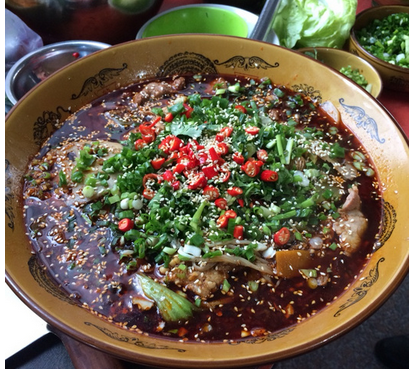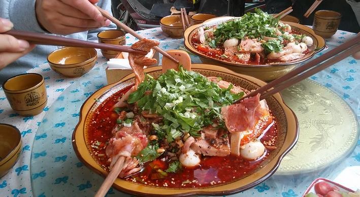成都张记冒菜成都的特色菜,常见的成都市井美食,川西平原专属的风味小吃。冒菜就是将各种菜品统一装在一个篓子里在汤料锅中煮熟,然后将煮熟的菜再用各种拌菜料拌匀装入碗中,舀入一定量的底汤交与食客食用的菜。其价格便宜,麻辣鲜香,既解馋又下饭。成都张记冒菜里煮菜的水采用大骨熬制成高汤,因此冒菜的汤可以喝,其味道鲜香无比,而火锅汤是无人敢送到嘴里喝的,这也是冒菜的特色。