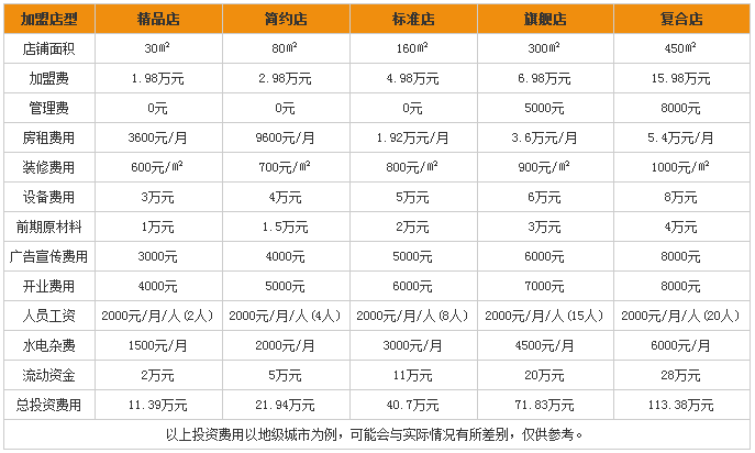 从表格中可以看到,加盟乐而美我们有多种店型可以选择,总共有五类店型,每一类对店铺面积和加盟费的要求各不相同,大家可以根据自己的经济条件自行选择店铺类型,小型精品店或简约店帮您节省开店的一大笔支出,加盟费只需要1.98万元,房租也仅需3600元每月,另外在人员工资上也可以省去多个员工的薪酬,每月开支在4000元左右,加上装修费、水电杂费和原料费等总共需要投资11.39万元,很适合初创业者和小型企业加入,复合型店虽然前期投入会比较多,加盟费上就要比精品店多投入十几万元,需要的人力和房租费用也都远高于其他店型,总共需要投入113.38万元,但是相比肯德基、麦当劳两大西式快餐巨头来讲已经算是很少的支出了,而且投入多,收益大虽然在其他领域不一定是定律,但是投资乐而美一定可以保证您的盈利,它在行业内的品牌实力和口碑定然会保障您后期经营的顺利。